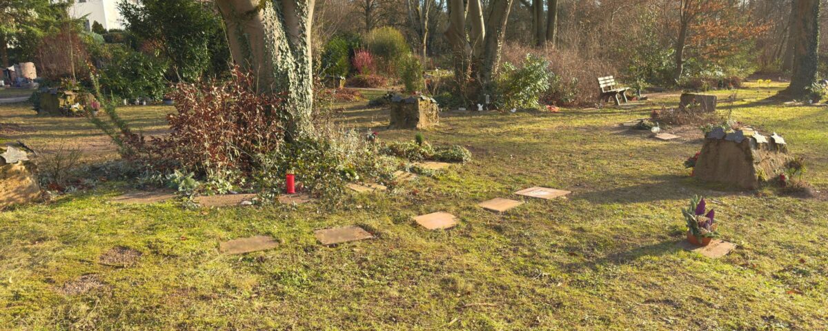 Hinweis: Die Kennzeichnung der Baumgrabstätten erfolgt durch eine im Umfeld des Baumes aufgestellte bodengleiche Sandsteingedenkplatte.