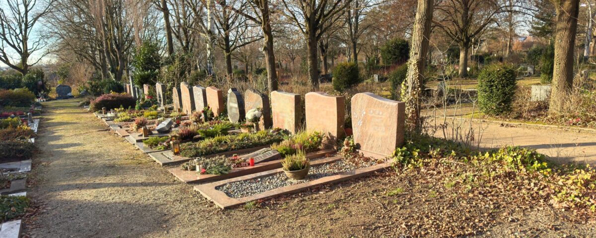 - Die Position der Grabstätte auf dem Friedhof kann nicht gewählt werden. Die Belegung erfolgt im jeweiligen Grabfeld der Reihe nach.